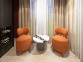 - Un coin salon a été aménagé près de la fenêtre : deux fauteuils sculpturaux en bouclette orange brûlée encadrent une table basse en marbre sur piètement cannelé. Les rideaux — voilage et occultant — permettent de moduler lumière et intimité selon les besoins.