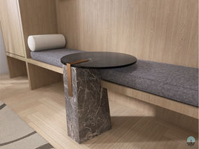 •Ambience: Although the space had to reflect a formal and professional atmosphere, soft textures and carefully chosen materials like the marble accent table and plush bench added elements of warmth to the design.
