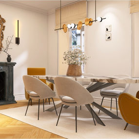 • Warm oaks, expressive marble, matte black metal, soft textiles in camel and taupe